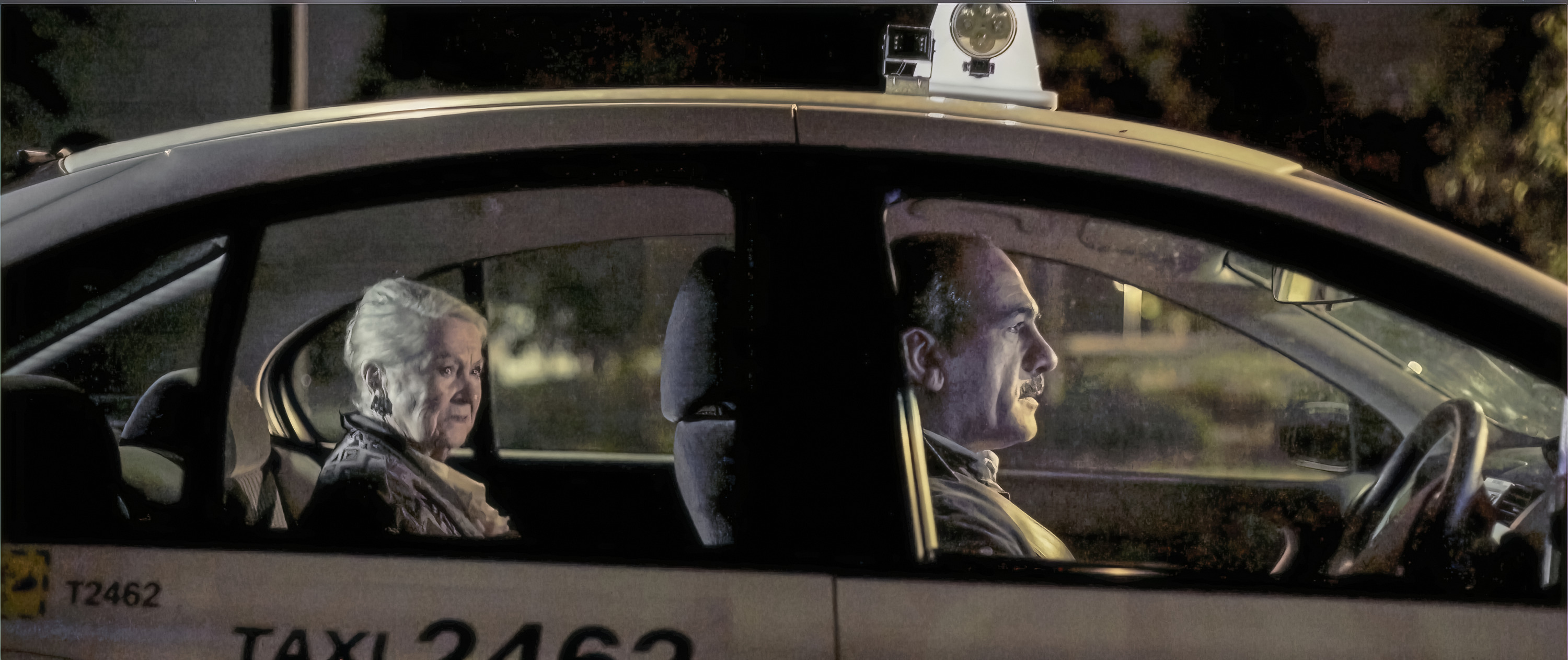 Ali is an undocumented man who is using another man’s taxi license to earn a little money to survive and Esther is an old woman who doesn’t know where she is going and doesn’t recognise the world anymore. The film takes place on a taxi journey where they both learn about each other in a world that is filled with surveillance cameras, constantly watching and judging.